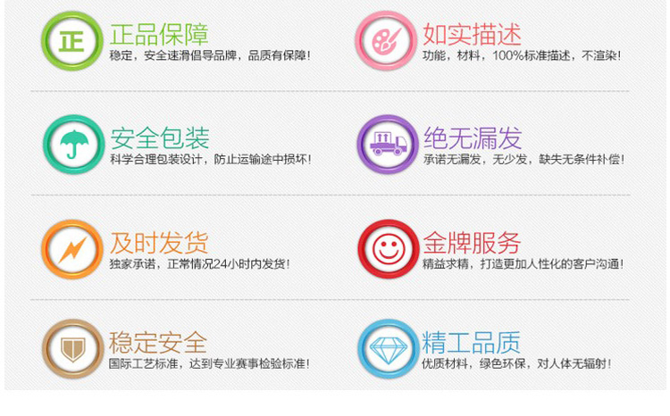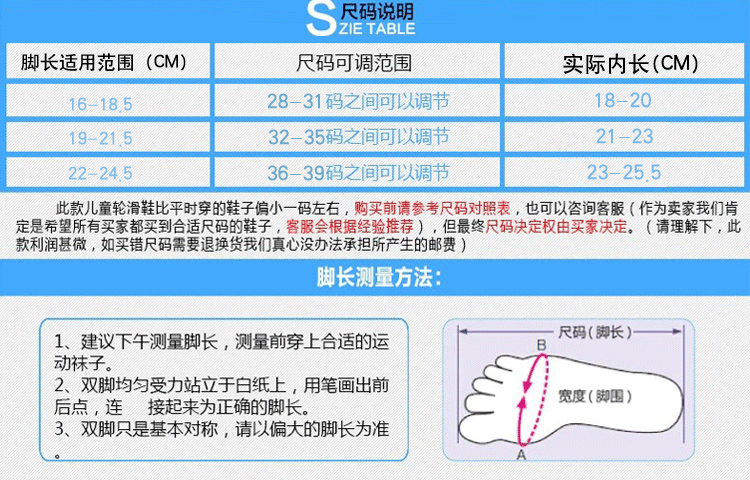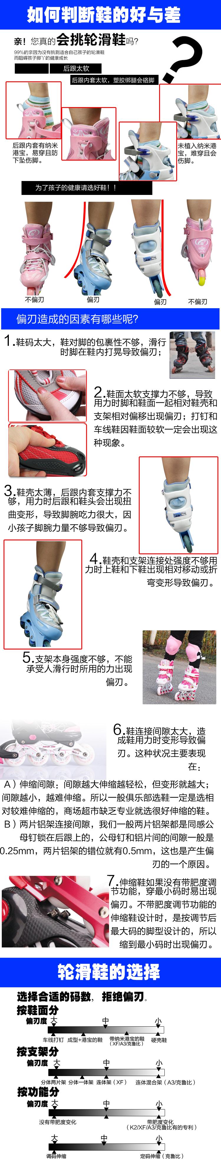 本店所有轮滑鞋按照国家鞋类3包:(如不喜欢,或者觉得大小不合适,本店可推荐适合的大小,但不接受以此来作为退货时被要挟的手段。7天内可退换,需不影响2次销售没有任何磨损,没有使用过,吊牌完好,自行负责运费。) 鞋类三包规定:(退换需在没有使用过的情况下。)一,三包限期:自购买签收之日起,三包期未满一个月。 二,三包范围: A,包修,在三包期内出现开胶,断线,螺丝滑丝保修,(经检测非人为损坏)。 B,包换,未经穿着的原残鞋,如两只鞋尺码大小不一,顺脚(同一边的),款式一只一样的,包换。 C,包退,如因本店发错尺码导致不能穿着,包退或包换一双同款同型号的其它码数。 三,有下列情形之一者本店不实行三包: A, 因消费者穿用或保养不当造成损坏的。 B,超出三包期限及规定的范围内的。 C,属处理品的。 D,消费者自行修理或拆动过得。(轮子,护具,头盔,轴承属于磨损件。不在保修范围)。 购买前请告诉业务平常穿多大鞋码,以便店主参考需要穿多大冰鞋,(但不作为退换时不负责运费的借口)如购买后觉得不合适需要换鞋在不缺货的情况下由买家自己负责双程运费帮大家换,但是请各位朋友也要帮忙,退换的鞋子需不影响2次销售,并且请包装好再发回,有的朋友拿回家穿过觉得想要更大的,缺还要穿着去溜几圈才发回,而且轮子都磨损了,也不把脏东西擦掉,鞋带也不整理好都粘在搭扣上拉毛了,随便往个纸箱里一扔就给我发回,那样的朋友真的很不道德,以后遇到这样的本店一律不换。请大家谅解!大家都不容易要将心比心! |
