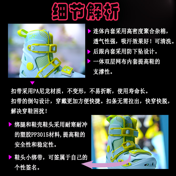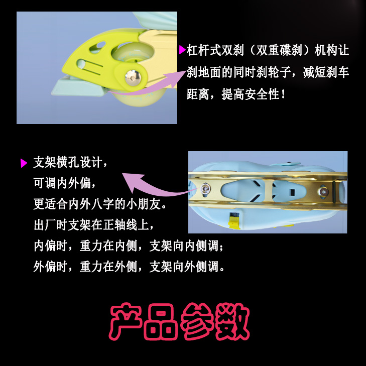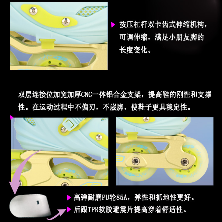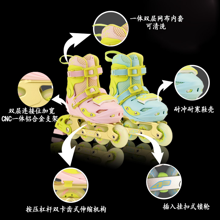 一体铝合金CNC支架新款儿童直排轮滑鞋 外观清爽简单大方实用性强 两个颜色三个码数 男女童可选相应配色