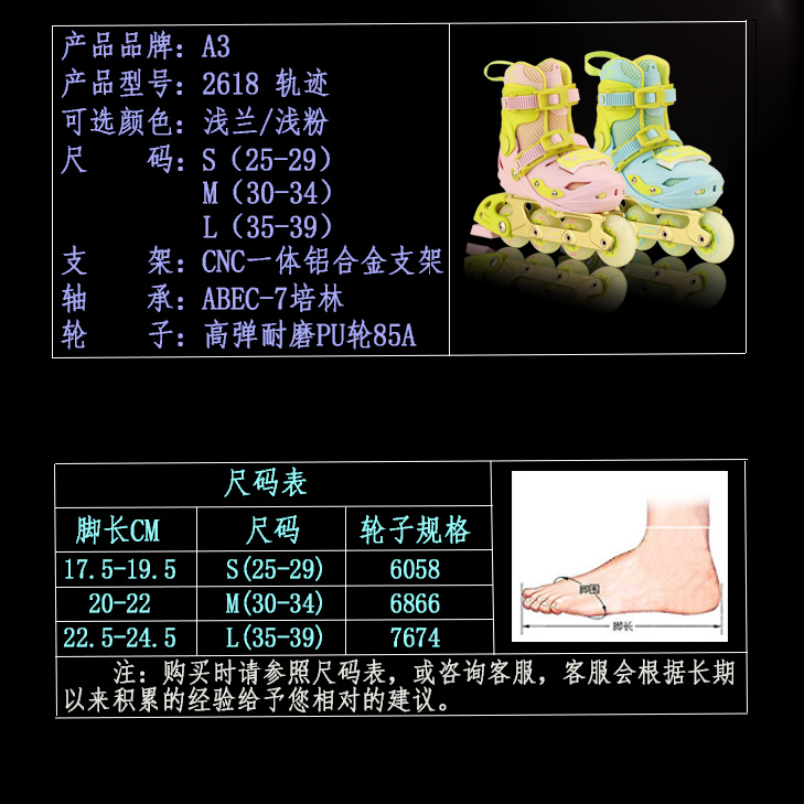 本店所有轮滑鞋按照国家鞋类3包:(如不喜欢,或者觉得大小不合适,本店可推荐适合的大小,但不接受以此来作为退货时被要挟的手段。7天内可退换,需不影响2次销售没有任何磨损,没有使用过,吊牌完好,自行负责运费。) 鞋类三包规定:(退换需在没有使用过的情况下。)一,三包限期:自购买签收之日起,三包期未满一个月。 二,三包范围: A,包修,在三包期内出现开胶,断线,螺丝滑丝保修,(经检测非人为损坏)。 B,包换,未经穿着的原残鞋,如两只鞋尺码大小不一,顺脚(同一边的),款式一只一样的,包换。 C,包退,如因本店发错尺码导致不能穿着,包退或包换一双同款同型号的其它码数。 三,有下列情形之一者本店不实行三包: A, 因消费者穿用或保养不当造成损坏的。 B,超出三包期限及规定的范围内的。 C,属处理品的。 D,消费者自行修理或拆动过得。(轮子,护具,头盔,轴承属于磨损件。不在保修范围)。 购买前请告诉业务平常穿多大鞋码,以便店主参考需要穿多大冰鞋,(但不作为退换时不负责运费的借口)如购买后觉得不合适需要换鞋在不缺货的情况下由买家自己负责双程运费帮大家换,但是请各位朋友也要帮忙,退换的鞋子需不影响2次销售,并且请包装好再发回,有的朋友拿回家穿过觉得想要更大的,缺还要穿着去溜几圈才发回,而且轮子都磨损了,也不把脏东西擦掉,鞋带也不整理好都粘在搭扣上拉毛了,随便往个纸箱里一扔就给我发回,那样的朋友真的很不道德,以后遇到这样的本店一律不换。请大家谅解!大家都不容易要将心比心! |
