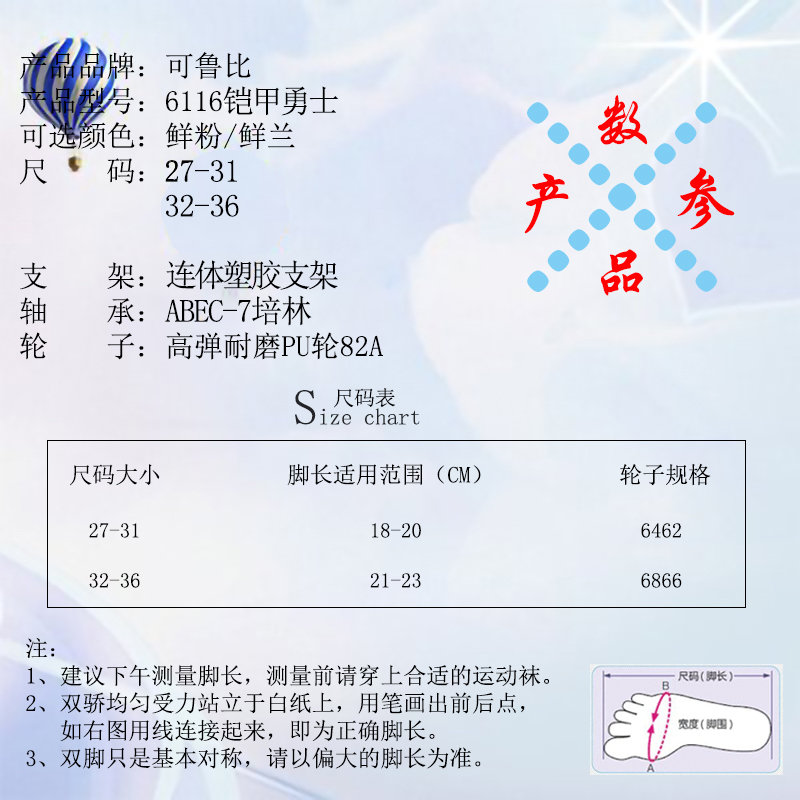 本店所有轮滑鞋按照国家鞋类3包:(如不喜欢,或者觉得大小不合适,本店可推荐适合的大小,但不接受以此来作为退货时被要挟的手段。7天内可退换,需不影响2次销售没有任何磨损,没有使用过,吊牌完好,自行负责运费。) 鞋类三包规定:(退换需在没有使用过的情况下。)一,三包限期:自购买签收之日起,三包期未满一个月。 二,三包范围: A,包修,在三包期内出现开胶,断线,螺丝滑丝保修,(经检测非人为损坏)。 B,包换,未经穿着的原残鞋,如两只鞋尺码大小不一,顺脚(同一边的),款式一只一样的,包换。 C,包退,如因本店发错尺码导致不能穿着,包退或包换一双同款同型号的其它码数。 三,有下列情形之一者本店不实行三包: A, 因消费者穿用或保养不当造成损坏的。 B,超出三包期限及规定的范围内的。 C,属处理品的。 D,消费者自行修理或拆动过得。(轮子,护具,头盔,轴承属于磨损件。不在保修范围)。 购买前请告诉业务平常穿多大鞋码,以便店主参考需要穿多大冰鞋,(但不作为退换时不负责运费的借口)如购买后觉得不合适需要换鞋在不缺货的情况下由买家自己负责双程运费帮大家换,但是请各位朋友也要帮忙,退换的鞋子需不影响2次销售,并且请包装好再发回,有的朋友拿回家穿过觉得想要更大的,缺还要穿着去溜几圈才发回,而且轮子都磨损了,也不把脏东西擦掉,鞋带也不整理好都粘在搭扣上拉毛了,随便往个纸箱里一扔就给我发回,那样的朋友真的很不道德,以后遇到这样的本店一律不换。请大家谅解!大家都不容易要将心比心! |